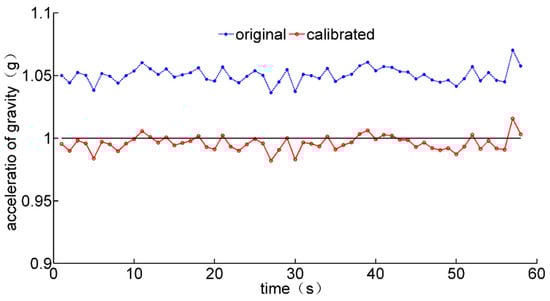 The comparisons of normalized acceleration data before and after calibration are shown in Figure 9. The theoretical value of normalized gravitational acceleration in the static state should be equal to 1. The accuracy of local gravitational acceleration is improved after calibration.