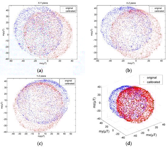 The geomagnetic field data should lie on the sphere equidistant from the center. The 3D scatter plots of the geomagnetic field data are shown in Figure 10. The comparisons of the geomagnetic field data on X–Y, X–Z, and Y–Z planes are shown in Figure 11. It can be seen that the data are distributed in a nearly elliptical shape before calibration, and in a nearly standard spherical shape after calibration.