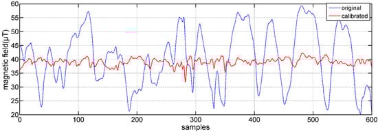 where denotes the raw data of the magnetometer; the corrected magnetic field data; the hard magnetic calibration parameters; the soft magnetic calibration parameters. The magnetometer should be rotated in all directions to find out the maximum and minimum values of each axis. The geomagnetic calibration parameters can be calculated as follows: