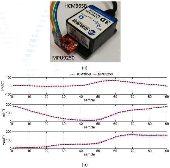 Comparisons of measured dynamic attitude angles between MPU-9250 and HCM365B. (a) HCM365B E-compass and MPU-9250 IMMU sensor; (b) dynamic attitude angle changes in motion.