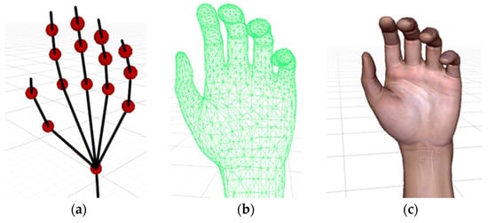 Human hand modeling in the Unity platform. (a) Hierarchy of joints; (b) hand skinned mesh; (c) virtual hand model.