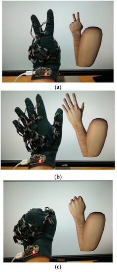 Gestures reproduced by the virtual hand in Unity. (a) Gesture “2”; (b) gesture “5”; (c) gesture “10”.
