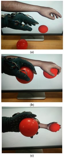 Interactions with a ball using the proposed data glove. (a) Locating the ball; (b) grasping the ball; (c) flipping the hand.