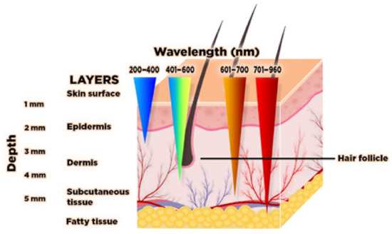 A vein finder device is primarily composed of a high power NIR-LED, which is the light source, an infrared-sensitive camera, a sensor to capture and format the acquired image real time [21], and a filter for purification by blocking unwanted wavelengths [22,23,24,25,26,27]. To mention, in previous studies, a low-cost LED as light source with complementary metal-oxide-semiconductor (CMOS) imaging sensors was utilized for spectrally encoded confocal microscopy (SECM) as an example of Reflectance confocal microscopy (RCM), a technology for acquiring confocal images [28]. This technology was primarily developed to provide a clearer visible image of the superficial veins. There are two basic principles for vein finders: the reflected light and transillumination. The reflected light type is commonly applied to hand-vein scanners and other commercial devices. The light from the source is reflected in the focused site, and the image is captured by a light sensitive camera at a given wavelength. For transillumination, the light is allowed to penetrate the skin and tissue of the site, and it is then followed by image captured by a camera [27]. The light source can be considered to be the main component of the device. With the electromagnetic spectrum’s range of 740 nm to 940 nm, the light can penetrate to about 5 mm deep of the skin tissue reaching the subcutaneous vein [29] together with the fat cells, arteries, and nerves [30]. Skin penetration of light is with various wavelengths (Figure 2). The lower wavelength of 200–400 nm can only reach the epidermis skin layer, while 400–600 nm up to the dermis skin layer, and 600–700 nm can reach the skin subcutaneous tissue [31,32]. Moreover, a variety of lasers and light sources other than the pulsed dye laser (PDL) are useful in the treatment of vascular lesions: continuous and millisecond pulsed lasers with wavelengths between green and yellow 532 nm and 585–600 nm, near infrared lasers 755-nm, 800–810-nm diode, 1064-nm [33].