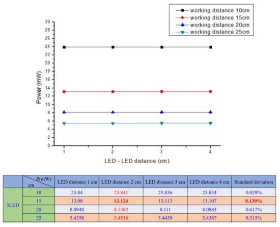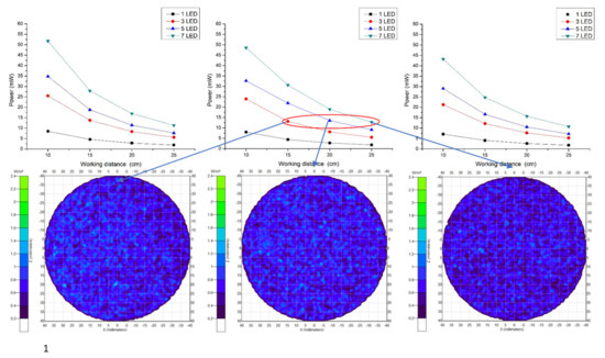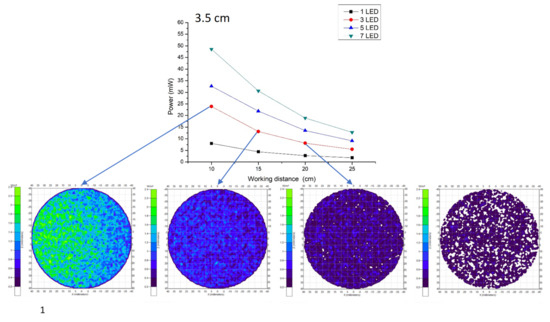 Light emitting diode (LED) power distribution at 3.5 cm CMOS Lens–LED configuration in different working distances.