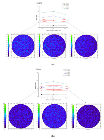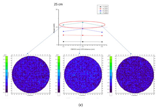 Power strength with different CMOS Lens–LED distances (a–c).