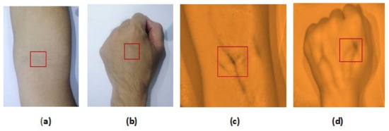 Arm images of two different subjects with skin marks due to a highly pigmented spot-epidermal melanin with non-visible vein (a,b).