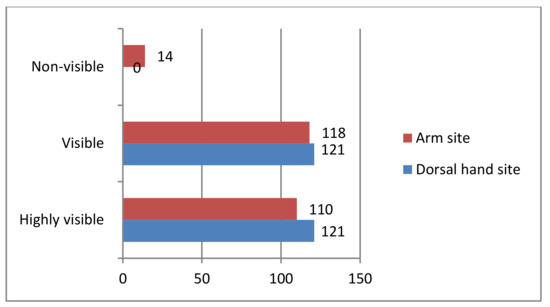 In the arm site, 110 (45.45%) are highly visible, 118 (48.76%) are visible, and 14 (5.79%) are non-visible, while, in the dorsal hand site, a result of 121 (50.00%) is equal for both highly visible and visible, while 0 (0.00%) for non-visible, as shown in Figure 11.