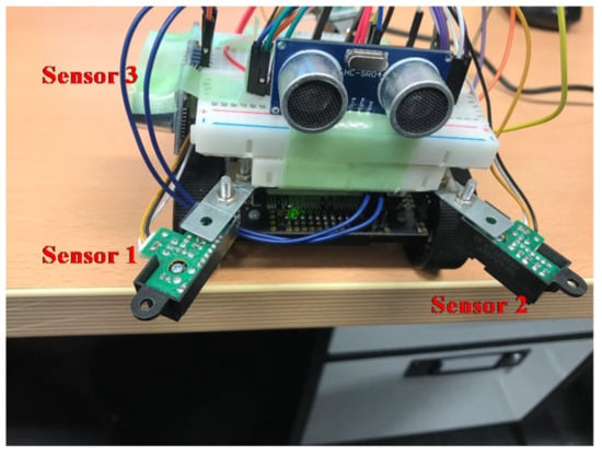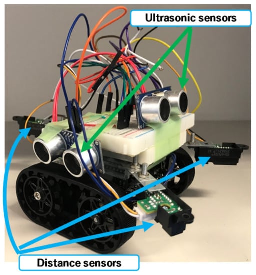 The small robot designed in this study was created by fitting a commercially available Zumo robot—a crawler robot with an attitude and heading reference system (AHRS)—with new sensors, a single-board microcontroller, and additional small sensors. As shown in Figure 2, the robot was equipped with two additional ultrasonic sensors (front and side) and three distance sensors (GP2Y0A21YK; two on the front and one on the back). The system processes and robot attitude control were performed using the installed single-board microcontroller (Arduino UNO).