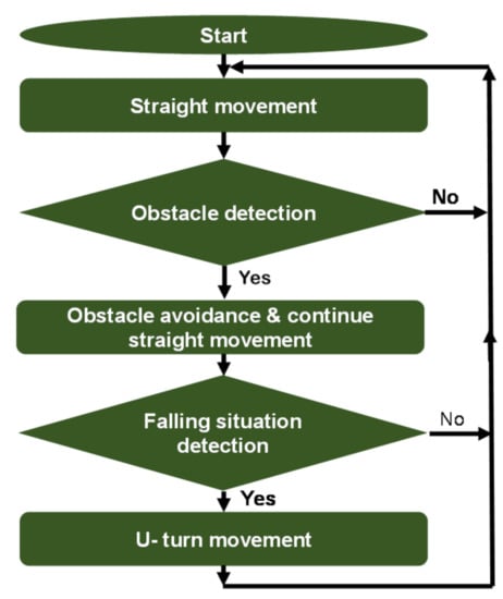 Fall prevention is an important part of ensuring the robot’s regular travel on a flat surfaces such as a table or solar panel. Further, obstacle avoidance and the subsequent return to the regular travel path is important. For obstacle avoidance, the aim is to avoid an obstacle of a certain size such as a cardboard box, and subsequently, to return to the regular travel path.