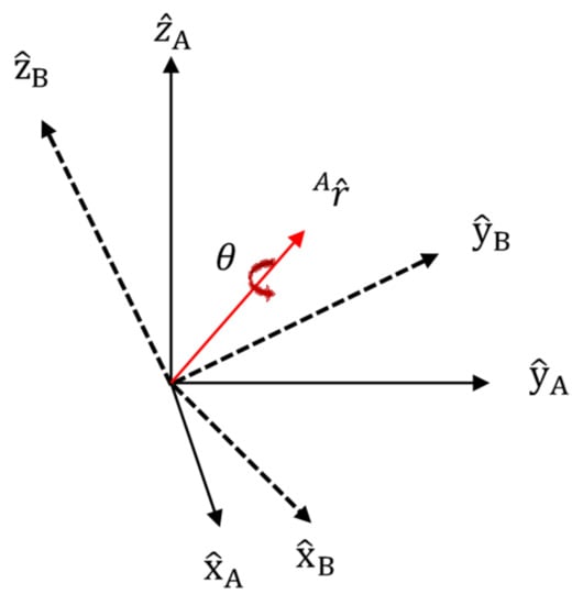 In Figure 5, are normalized coordinate axes in relation to arbitrary orientation A; are normalized coordinate axes in relation to arbitrary orientation B; is the vector in relation to arbitrary orientation A; and is the angle. The unit matrix for A in relation to orientation B, is shown in Equation (2). Here, are the vectors for each element.