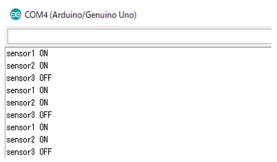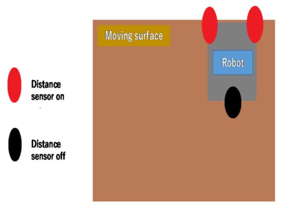 Fall prevention was achieved using the three distance sensors installed on the robot. Only one sensor was installed on the back of the robot because backward movement is performed by the robot in only a few limited scenarios. A threshold was set for the distance sensors to distinguish between the table (ON) and the other objects (OFF). When both sensors were switched to ON, the robot was stopped. Figure 6 shows the ON and OFF statuses of the sensors when the robot was stopped; these thresholds were determined experimentally for this study. After the robot temporarily stopped during its regular travel (Figure 1), it moved backward, made a U-turn, and continued its operation. On the other hand, if the one of two sensor pair was ON, the robot stopped the movement, and turning behavior was not done.