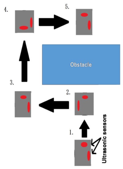 We studied the autonomous obstacle detection of an object of certain size by a robot, its avoidance, and the subsequent return of the robot to its regular travel path. This operation was performed using ultrasonic sensors installed on the front and side, in the sequence shown in Figure 7. The steps are listed below.