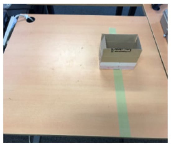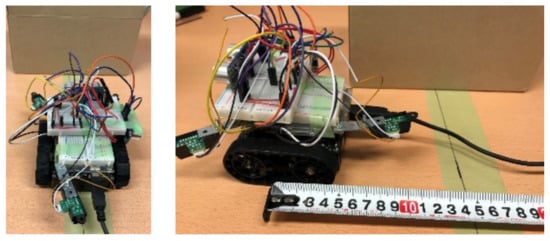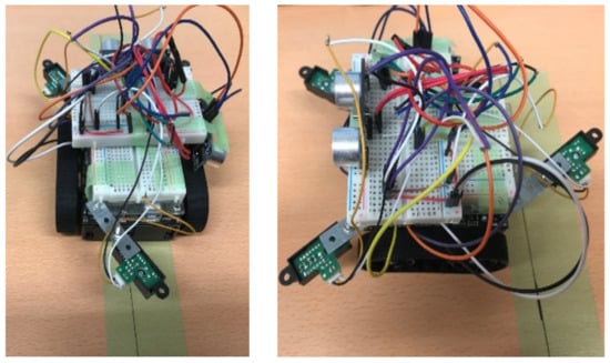 Obstacle avoidance and the subsequent return to the original travel path were verified by placing an obstacle on the table. The environment is shown in Figure 7. We verified whether the designed robot detected the obstacle and returned to its original travel path while avoiding the obstacle. Further, we verified the accuracy by placing the robot on a green line of table and checking whether the robot had returned to its location on its original travel path after avoiding the obstacle. In this work, the on-robot microcontroller (Arduino UNO) implemented all the robot motions.
