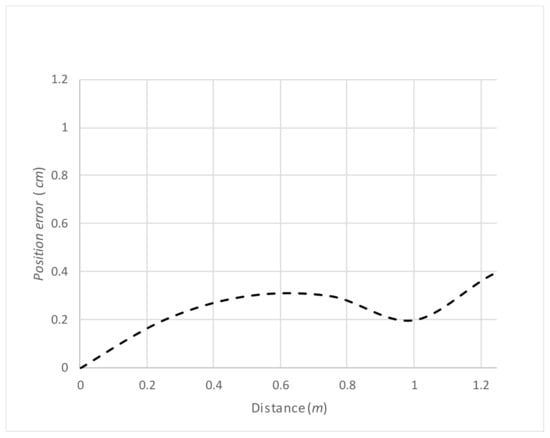 First, we conducted an experiment regarding the overall regular travel in the experimental environment shown in Figure 7. The experimental results of an overall travel of the robot on the table are demonstrated in Supplementary Materials Video S1. In the experiment shown in Supplementary Materials Video S1, the travel-path length and time were 465 cm and 75 s, respectively. For the same experiment, the measurement results for the errors in the location of the robot during travel are shown in Figure 15, and the trajectory of the expected travel and the real robot movement are shown in Figure 16. The errors were measured by drawing a straight line on the tape we applied on the table, and by having the robot travel autonomously on that line. The errors showed a tendency to increase depending on the traveled distance.