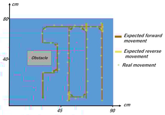 The robot’s operation involved rectilinear movement until the obstacle was found, and the avoidance of this obstacle so that the robot could return to its original travel path. Figure 13 shows the position of the robot when it detected the obstacle, and the random coordinate location of the robot during avoidance measured using a ruler. The measured coordinates of the robot when these measurements were taken are shown in Figure 14, and both were virtually consistent. Please see Supplementary Materials Video S1 for the obstacle avoidance performance.