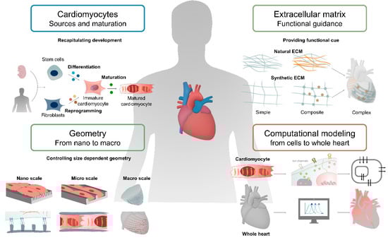 In this review, we introduce key techniques for the fabrication of cardiac tissue, focusing on components used to model the heart, such as cardiomyocyte, cardiac ECM, and geometry. Next, we discuss how computational modeling of the heart provides a novel perspective to better understand the physiology of the heart, which allows for better design rules for the preparation of matured cardiac tissue. We also describe how to recapitulate the function and structure of the heart by utilizing the recently developed techniques and applications for advances in the field of cardiac tissue engineering (Figure 1).