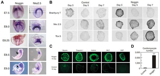 (A) Transient expression of noggin according to mouse embryo stages in whole in situ hybridization of noggin and Nkx2.5. (B) Section images of embryoid bodies in the control group and noggin-treated group. (C) Immunostaining of embryoid body with cardiomyocyte-specific antibodies. (D) The number of cardiomyocytes in the embryoid body. Reprinted with permission from Ref. []. Copyright 2005 Nature Publishing Group.