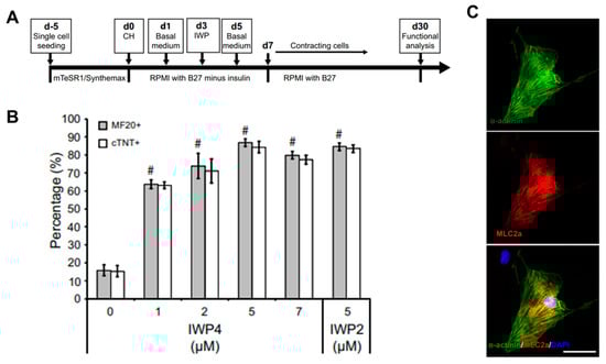 (A) Schematic protocol for differentiation of human pluripotent stem cells (hPSCs) into cardiomyocytes. (B) Differentiation of cardiomyocytes as a function of IWP4 and IWP2. (C) Immunostaining images of cardiomyocyte differentiated from hPSCs (scale bar: 50 μm). # p < 0.005, each point versus no drug; Student’s t test. Reprinted with permission from Ref. []. Copyright 2021 National Academy of Sciences.