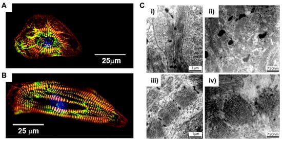 Representative immunofluorescent images of immature cardiomyocyte (A) and mature cardiomyocyte (B). The cells are stained with a-actinin (green), phalloidin (F-actin, red), and Hoechst 33342 (nuclei, blue). (C) Ultrastructure of immature cardiomyocyte sarcomere (i) and Z-band (ii), and mature cardiomyocyte sarcomere (iii) and z-band (iv). Reprinted with permission from Refs. [,]. Copyright 2019 Elsevier B.V. (Amsterdam, Netherlands) and Copyright 2003 the American Physiological Society, respectively.