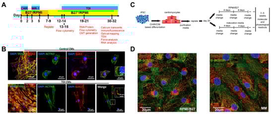 The widespread engagement of hPSC-derived cardiomyocytes (CM) differentiation techniques led to advances in the field of cardiac tissue engineering. However, the major obstacle in their application is that these are immature cardiomyocytes []. During mammalian heart development, cardiac cells undergo a highly dynamic process, including specification, morphogenesis, and maturation. Through this process, mature cardiomyocytes significantly differ from immature cardiomyocytes in terms of their morphological structure, e.g., cell size, junction, and myofibril formation, and biological functions such as electrophysiology and metabolism [].