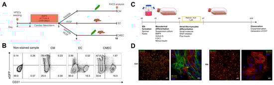 Advances in differentiation technology have led to the improvement of cardiac differentiation, i.e., the induction of specific cardiomyocyte types and other major cells of the heart. Giacomelli et al. simultaneously differentiated cardiomyocytes and endothelial cells from hPSCs and established the protocol (Figure 6A,B) []. They induced initial cardiac mesoderm with BMP4, activin A, and CHIR 99021, and treated XAV939 and VEGF to induce co-differentiation of cardiomyocytes and endothelial cells. In the early cardiac mesoderm state, XAV939 treatment differentiated mesoderm cells into cardiomyocytes, while VEGF treatment differentiated mesoderm cells into endothelial cells. It was also suggested that EC has endothelium identity by expressing cardiac-specific markers such as MEOx2, GATA4, GATA6, and ISL1 in addition to vascular markers such as KDR, VEC, and CD31. In addition, Lee et al. generated atrial-type cardiomyocytes from hPSCs and showed that retinoic acid (RA) signaling is required for atrial specification during the mesoderm development stage []. In particular, they found that atrial and ventricular cardiomyocytes could be distinguished based on CD235a and RALDH2 expression in the early cardiac mesoderm. RA signaling induced expression of RALDH2 in the mesoderm, leading to differentiation into atrial-type cardiomyocytes. Furthermore, Lemme et al. generated 3D atrial engineered heart tissue (RA-EHT) based on the retinoic acid protocol (Figure 6C,D) []. RA-EHT showed atrial electrophysiological properties such as low force generation and short action potential duration, as well as atrial-specific markers such as COUPTFII and MLC2a in mRNA and protein expression. Based on the specific differentiation protocol of previous studies, Zhao et al. created a 3D chamber-specific cardiac tissue consisting of atrial myocardial cells on one side of the tissue and ventricular myocardial cells on the other side of the tissue []. Chamber-specific cardiac tissue showed different gene expression and beating properties according to atrial and ventricle phenotypes, and the response to the drugs was also different. These studies suggested that type-specific cardiomyocyte generation could provide an in vitro model similar to the in vivo one for cardiotoxicity testing, disease modeling, and regenerative medicine.