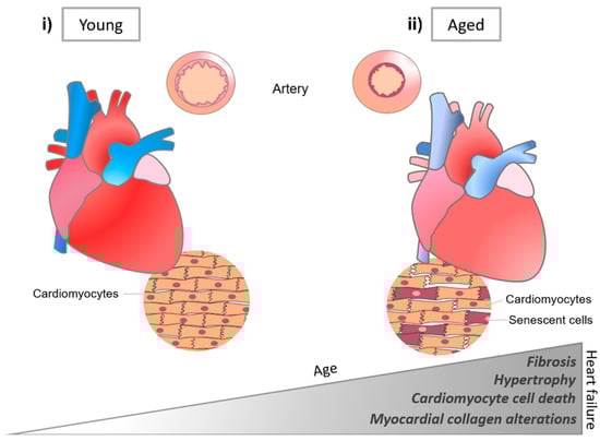 Schematic of the heart by aging. Young and aged hearts show different heart vasculature and tissue integrity. Due to aging, matrix changes in the heart contribute to the development of various cardiovascular diseases leading to heart failure.