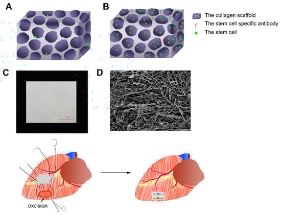 Collagen scaffolds for enhanced tissue regeneration. (A) Unmodified stem cells retained on collagen scaffold. (B) Addition of stem cell-specific antibody in the collagen scaffold. (C) Macroscopic observation of the scaffold. (D) SEM image of collagen scaffold. Reprinted with permission from Ref. []. Copyright 2010 Elsevier Ltd.