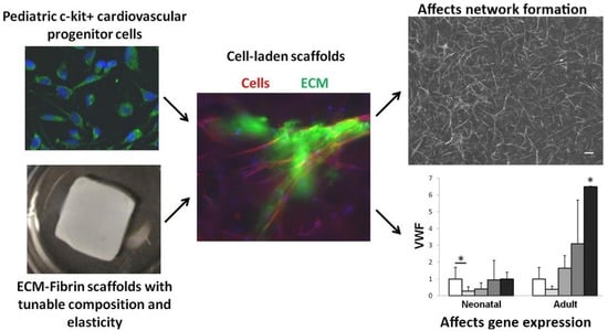 The cardiac ECM‒fibrin hybrid scaffold as an approach to control mechanical and biochemical signals in cell fate. * = Significant difference for p < 0.05 (N = 3–4 per condition). Reprinted with permission from Ref. []. Copyright 2014 Acta Materialia Inc. (Amsterdam, The Netherlands).