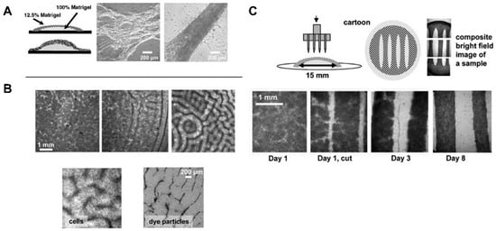 Matrigel is an ECM-mimicking hydrogel produced by mouse Engelbreth‒Holm‒Swarm tumors []. It is cytocompatible and resembles the native ECM due to its composition and assembling structure, such as growth factors and basement membrane proteins, including laminin, collagen IV, and enactin []. Additionally, compared with other natural hydrogels, Matrigel is capable of faster vascularization []. Matrigel is also utilized in in vitro models that are capable of mimicking 3D microenvironments with conditions for mechanical load (Figure 10) []. In a study by Zhang et al., a novel modified cardiac explant Matrigel assay was developed. The benefits of this Matrigel were tested under normoxia and hypoxia conditions by observing the ability of the cardiac explants to form vascular sprouts. It was revealed that the morphology of these sprouts was consistent with myocardial capillary formation in vivo []. Cardiac progenitor cells (CPCs) derived from embryonic heart tubes were seeded into Matrigel and differentiated into cardiac pacemaker cells after endothelin-1 treatment. Spontaneous beating tissue, namely TECP (transplantation of a tissue-engineered cardiac pacemaker), were obtained []. Due to the variation in Matrigel’s matrix composition and the presence of unknown cell signaling factors, studies are often unrepeatable. Furthermore, the medical applications of Matrigel are limited and compromised since it originates from cancerous living tissue.