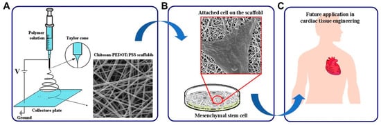 Conductive nanofiber scaffold with Chitosan and PEDOT: PSS. (A) Scaffold design and physical property. (B) Cell attachment on the scaffold. (C) Potential future applications in cardiac tissue engineering. Reprinted with permission from Ref. []. Copyright 2019 Elsevier B.V.
