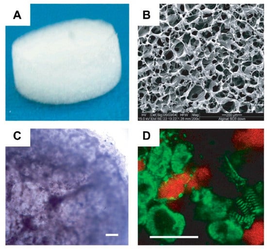 Alginate/alginate‒sulfate scaffold for cardiac patch construction. (A) Scaffold properties before cell seeding. (B) SEM image of the scaffold. (C) Distribution of cells in the matrix. (D) Cardiac cell organization in the matrix. Scale bar: 200 μm (C); 10 μm (D). Reprinted with permission from Ref. []. Copyright 2021 National Academy of Sciences.