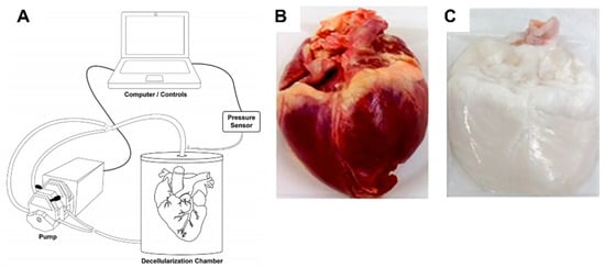 Images of decellularization chamber setup (A); native control porcine heart (B); and decellularized porcine heart (C). Reprinted with permission from Ref. []. Copyright 2017 Whioce Publishing Pte. Ltd. (Ang Mo Kio, Singapore).