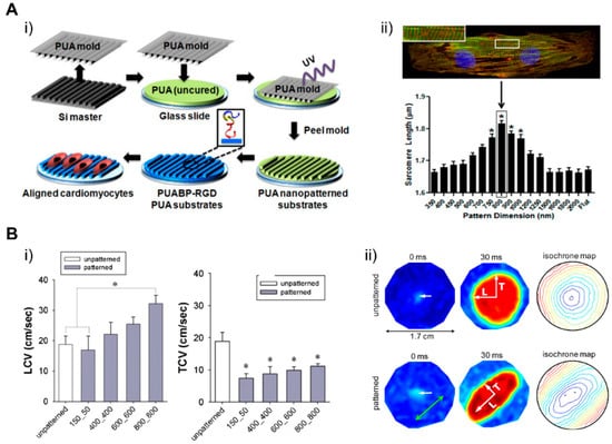 - Feinberg, A.W.; Alford, P.W.; Jin, H.; Ripplinger, C.M.; Werdich, A.A.; Sheehy, S.P.; Grosberg, A.; Parker, K.K. Controlling the contractile strength of engineered cardiac muscle by hierarchal tissue architecture. Biomaterials 2012, 33, 5732–5741. [Google Scholar] [CrossRef]