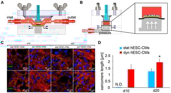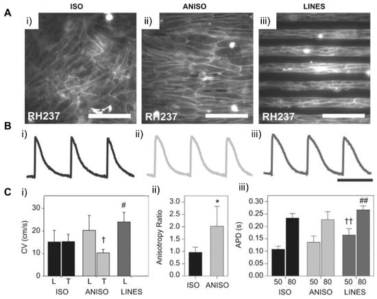 Cardiomyocytes are anisotropically aligned with cardiac fibroblasts in the myocardium, forming cardiac muscle fibers with gab junctions []. In particular, each cardiomyocyte is joined at the end by intercalated disks to construct long fibers supported by fibroblasts that regulate cardiac ECM and electrical currents in a cardiac conduction system [,]. Therefore, the geometrical alignment (or guidance) of cardiac cells is an important factor in the construction of mature cardiac tissue. It is known that geometrical guidance induces anisotropic alignment of cells and leads to the structural and functional maturation of cardiac tissue [,]. The application of physical force to cardiac tissue is another type of geometrical stimulation since cardiomyocytes deliver tensional force to each other []. A microphysiological system, such as an organ-on-a-chip, is a useful platform to investigate the effect of geometrical cues and physical force on cardiac tissue.