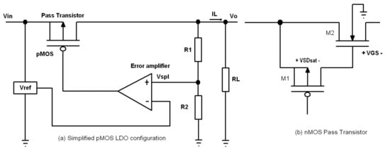 Simplified block diagram of a general linear regulator. (a) low dropout (LDO) linear regulator (having pMOS pass transistor). (b) a typical configuration of an nMOS pass transistor.