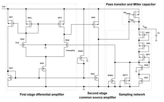 In our design, we have used a two-stage error amplifier (EA). In literature, EAs with two stages are more often used. In this manner, an acceptable open loop gain is provided, which is needed to fulfill various expected metrics of the regulator, such as stability [31]. The first stage is an nMOS input double-to-single-ended differential amplifier, which is cascaded with a pMOS common source amplifier (Figure 3). This configuration has proved to have better line regulation and PSRR performance among the other possible configurations [31].