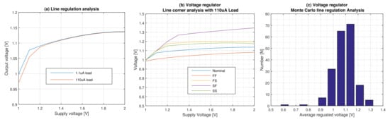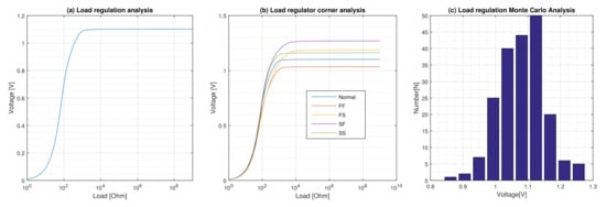 The results of the corner and Monte Carlo simulation analysis for load regulation are shown in Figure 4b,c, respectively. The effect of process variations is analyzed by using worst typical and best case models of components. Usually, combinations of fast (F) and slow (S) nMOS and pMOS devices are considered creating four extreme corners of operation for the circuit: FF, FS, SF, and SS. The result of the process variations on the load regulation of the regulator for the nominal load is fluctuations of −7, +15.5. This result is achieved without applying trimming.