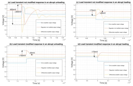 The reactions of the regulator in abrupt load change are shown in Figure 5. An abrupt load change with 10 rise and fall time, specially from nominal load to the minimum one, results in considerable fluctuations of +300 and −650 from the nominal 1.1 V regulated voltage and ringing (Figure 5a). This results in a transient response of = 950 , which is very high and unacceptable. By modifying the aspect ratio of the MP4 device, the regulator could confine this figure to = 180 (+150 and −30 ) as is shown in Figure 5b. For a loading condition where fluctuations span between −170 and +20 (), the role of the proposed modified circuit is to provide a soft response removing overshoots and ringing (Figure 5c,d).
