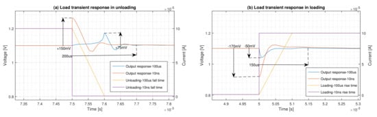 The performance of the regulator in abrupt load changes with 10 rise and fall times is compared with that of the moderate load changes with 100 rise and fall times in Figure 6. As is shown in Figure 6a, the overshoot is confined for the unloading case from +150 to +75 . It is clear from Figure 6b that the undershoot for loading condition is reduced from −170 to −50 , and the ringing is completely disappeared. This results in and for moderate unloading and loading condition, respectively.