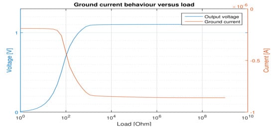 The quiescent (ground) current of the whole regulator including the embedded voltage reference decreases by increasing the load current (Figure 7). As far as the regulator can perform its regulation task, the ground current decrease (from 854 to 800 ) is not sensible from the minimum to the nominal load. But, when there is no regulation, it decreases rapidly to 100 . This is due to the error amplifier configuration that is used in our work. When higher load current is needed the second stage of the error amplifier conducts less current to increase the . In this manner, less current is drawn from the supply source.