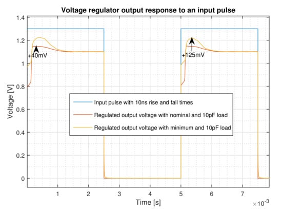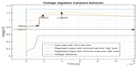 The line regulation of the proposed regulator is shown in Figure 9a. It is clear from this figure that, for both nominal and minimum loads conditions, the regulator can regulate 1.1 V at 1.3 V input voltage, and it can provide 5.7 regulation up to 2 V input voltage. This means that the dropout voltage at 1.3 V input voltage is 200 .