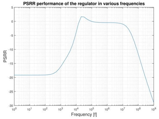 The ability of the regulator to withstand against the variations originated from the supply voltage is expressed through the line regulation () and power supply ripple rejection ratio (PSRR). For line regulation, the DC gain of the error amplifier is involved, and, for PSRR, its AC gain is taken into account. For regulators that have a dominant pole behavior, it is clear from the above definition that PSRR is equal to the line regulation for the frequencies below the cutoff frequency. It degrades constantly from this frequency up to the unity gain bandwidth frequency. Beyond that, the error amplifier loses its control over the output voltage regulation and it is the output capacitance that if selected correctly should be able to damp the output variation [17]. For example, for a typical regulator that has 80 of PSRR at 10 Hz, its PSRR can fall to as little as 20 at a few tens of kilohertz [18].