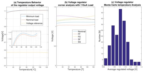 The behavior of the regulated voltage under temperature variation for both the nominal and the minimum loads is shown in Figure 13a. In this figure, the temperature behavior of the embedded voltage reference is also shown. The temperature coefficient (TC) of the voltage reference is 40 PPM/ in a temperature range of −55 to 125 . As can be seen in this figure, the load current has not much effect on the regulator output voltage when the temperature rises. But at low temperatures more voltage drops occur at high currents. The TC of the proposed regulator is equal to 91PPM/ in a temperature range of 25 to 125 . The corner analysis of the circuit for the nominal load shows −6.4 and +14.5 and for the minimum load shows −5.5 and +15.4 deviations from the nominal value due to process variations (Figure 13b). The result of the Monte Carlo analysis for the average value of the regulated voltage is also shown in Figure 13c for the nominal load.