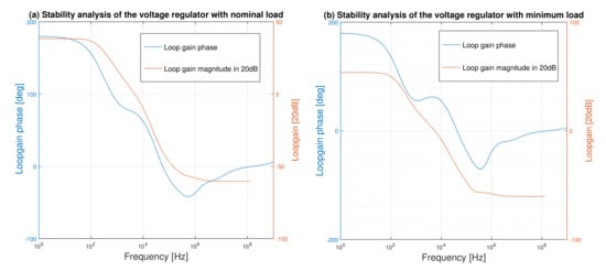 Bode plot stability analysis of the voltage regulator. (a) Nominal load. (b) Minimum load.