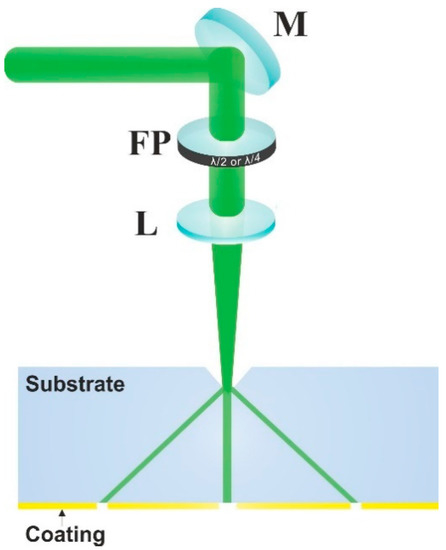 The experiments were conducted using picosecond laser Atlantic (Ekspla): fundamental harmonics wavelength 1064 nm, pulse energy up to 150 µJ, pulse repetition rate up to 1 MHz, pulse duration 10 ps, second (532 nm) and third (355 nm) harmonics available. A laser beam was focused using one of the focusing 50 mm or 100 mm focal length lenses for 355 nm, and a 50 mm focal length focusing lens for 1064 and 532 nm. Spot size radii using 1064 nm and 532 nm wavelengths were 19.5 µm and 12.5 µm, respectively. A laser beam was scanned by displacing the sample with respect to the laser beam using XYZ translation stages (ALS10020, Aerotech). Scanning speed of 10 mm/s and 100 kHz pulse repetition rate was used for all scribes in the gold coated soda-lime samples. Scanning speed of 100 mm/s and 400 kHz pulse repetition rate using the third harmonics was employed for trench ablation in the SiC and sapphire wafers. Polarization was controlled using an appropriate half wave or quarter wave plate (see Figure 1).