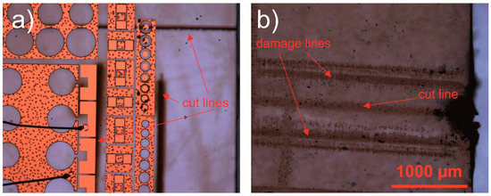 Figure 2 shows optical microscope images of laser ablated trenches in SiC and sapphire substrates, which have AlGaN/GaN heterostructures with electronic devices on a backside. Ablation of trenches was performed always from the substrate side. Damaged areas on the opposite side of the substrate near the cut line were found in the sample shown in Figure 2b only.