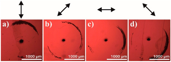 The properties of the damage generation were investigated in detail, employing the 1 mm thick glass samples with a 30 nm thick gold films deposited on the backside. Samples were irradiated by a focused laser beam for some duration without moving the beam or the sample. Figure 3 shows typical damage shapes in a gold coating for several polarization states. The damage areas formed at 800–1050 µm distance from the irradiation spot (black dot in the image center). It was seen that the damage zones formed in those sections of the circular areas, surrounding the irradiation spots, which lie roughly parallel to the polarization direction. The polarization is indicated by the double arrows above the microscope images shown in Figure 3. The relatively large distance from the irradiated spot to the damage zone, the ratio of distance/sample thickness ≈ 1, was in agreement with the results reported in [6,10], where refraction from the crater walls was proposed as a damage formation mechanism. The ratio damage distance/sample thickness ≈ 0.5 was considerably larger than those reported considering other known damage formation mechanism by laser beam; for example, the beam diffraction from the ablated crater. The diffraction of radiation from the opaque zone in the irradiated spot (diffraction from the inverse aperture) in the case of 1 mm thick substrate would produce high intensity ring much closer to the irradiated spot (<50 µm) with the ratio damage distance/sample thickness < 0.05 [11].