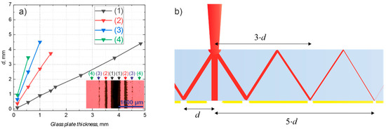 (a) distance d from the laser scan line to the damage area in the gold coating on various thickness glass plates, (1)–(4) denotes the first, second, etc. damage zones, insert shows damage zones in the coating on 0.15 mm-thick substrate; (b) illustration of the formation of high order damage zones by multiple reflections.