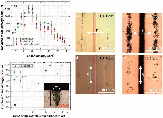 Some alterations in the backside coating could be seen even for S polarization at low fluencies (shown in Figure 5a as hollow symbols). Also, it can be noted that the distance from the trench to the damaged zone depends on the fluence and reaches a peak at about 5.5 J/cm2 independent of polarization. This can be related to the change in crater shape with increasing fluence. Figure 5f shows dependence of the distance to the damage zone on the ratio of ablated trench width and depth when using S polarized laser beam. It is evident that the distance to the damage zone changes with the final shape of the ablation crater.